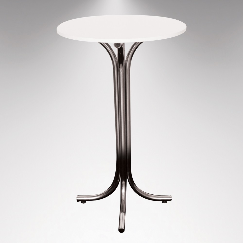 Base metálica cromada com encaixe; tampo de mdf branco redondo 8mm.