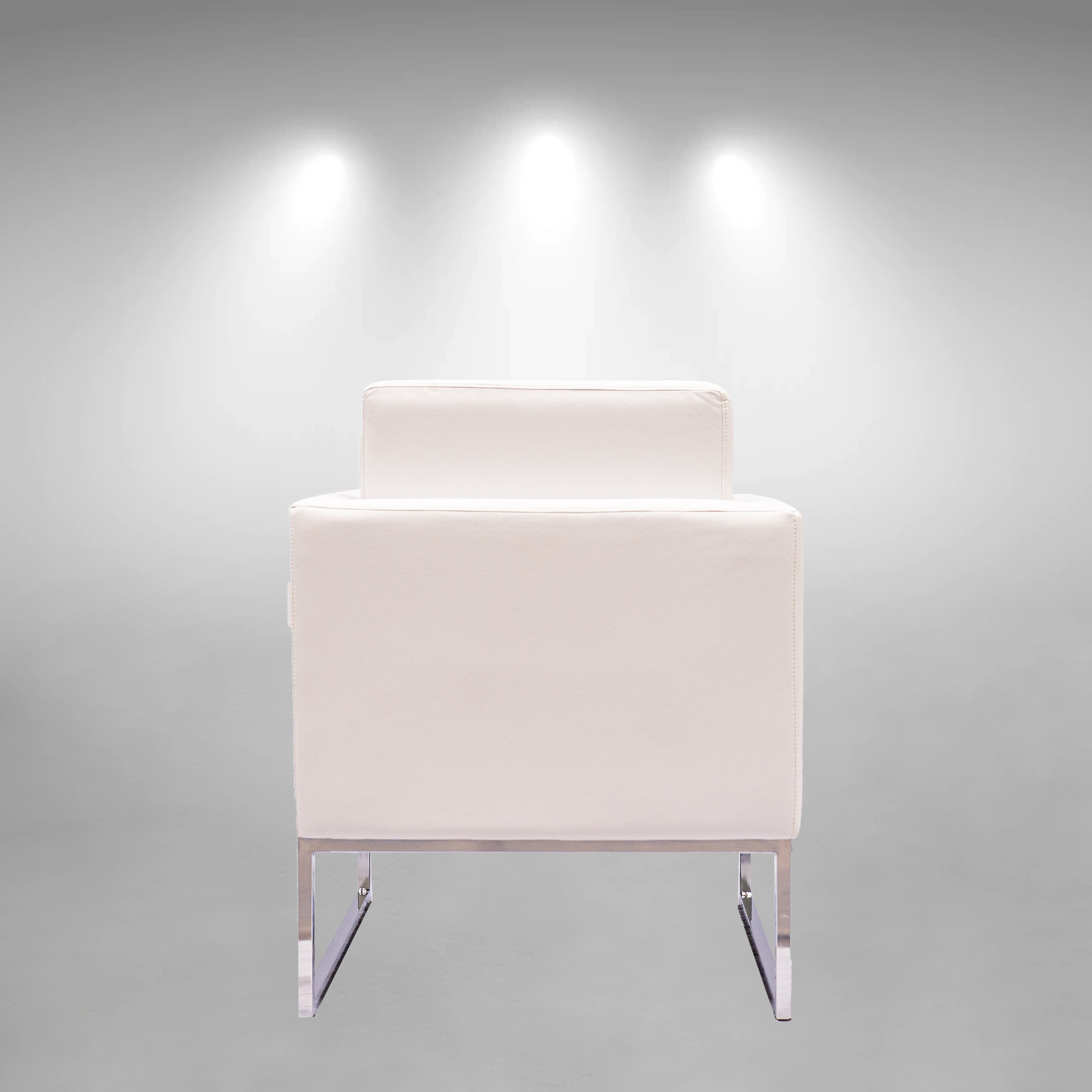 Base fixa em alumínio; assento, braço e encosto estofados revestidos em couro ecológico cor branca.