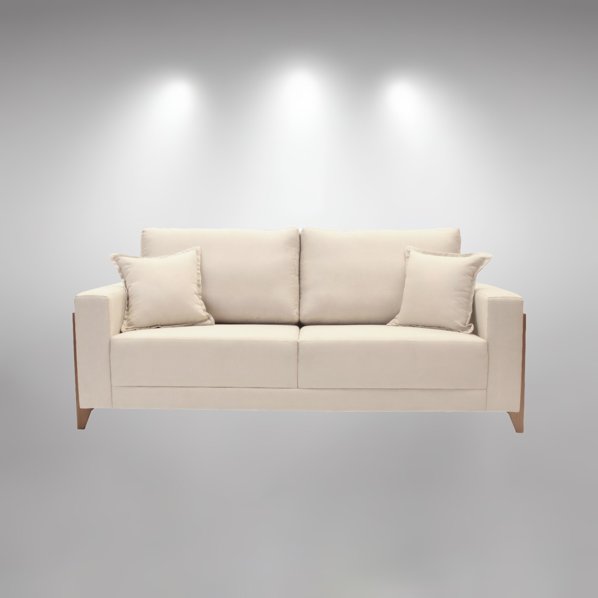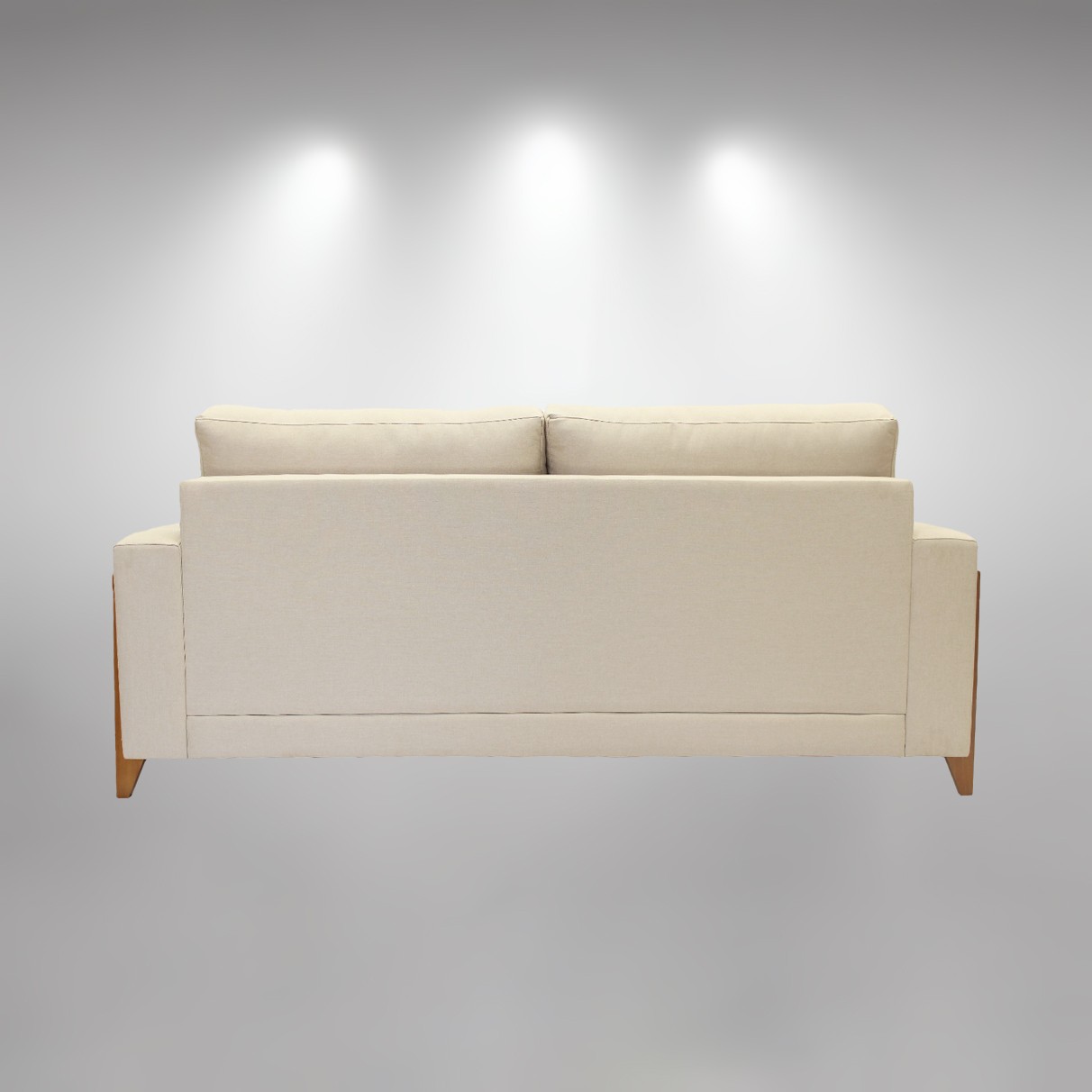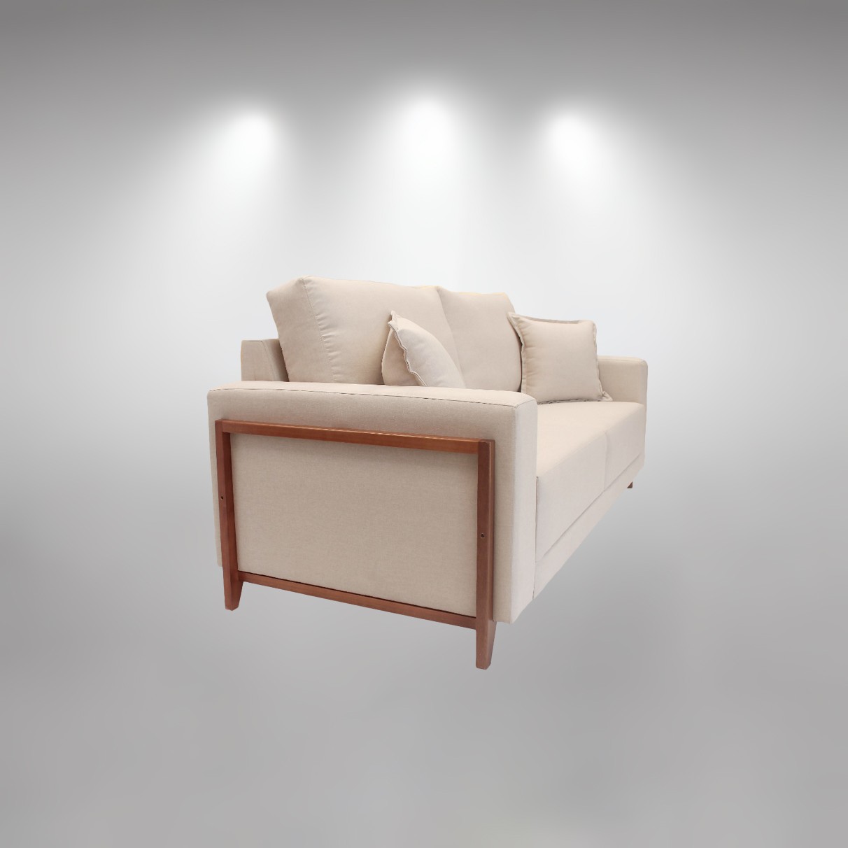 Corpo e braços baixos estofados revestidos em linho, cor bege claro; estrutura de eucalipto proveniente da área de reflorestamento.